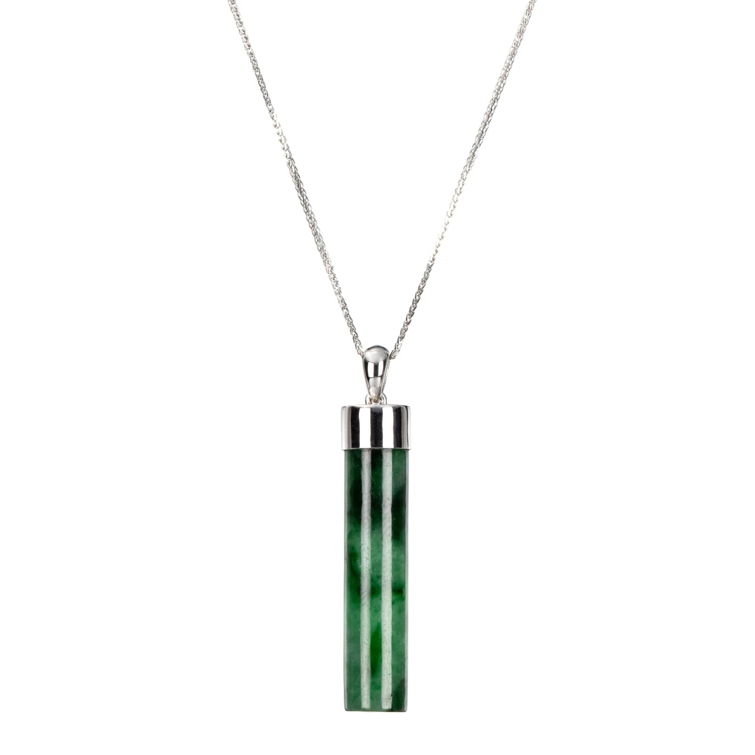 Crafted from 9K white gold, this pendant offers a lustrous sheen that complements the green and black jadeite beautifully. The vibrant green hue, contrasted by the dark green pattern, is naturally captivating and sure to draw compliments. The jadeite cylinder is intricately designed and polished to perfection, showcasing the depth of its stunning colors and the delicate artistry involved.