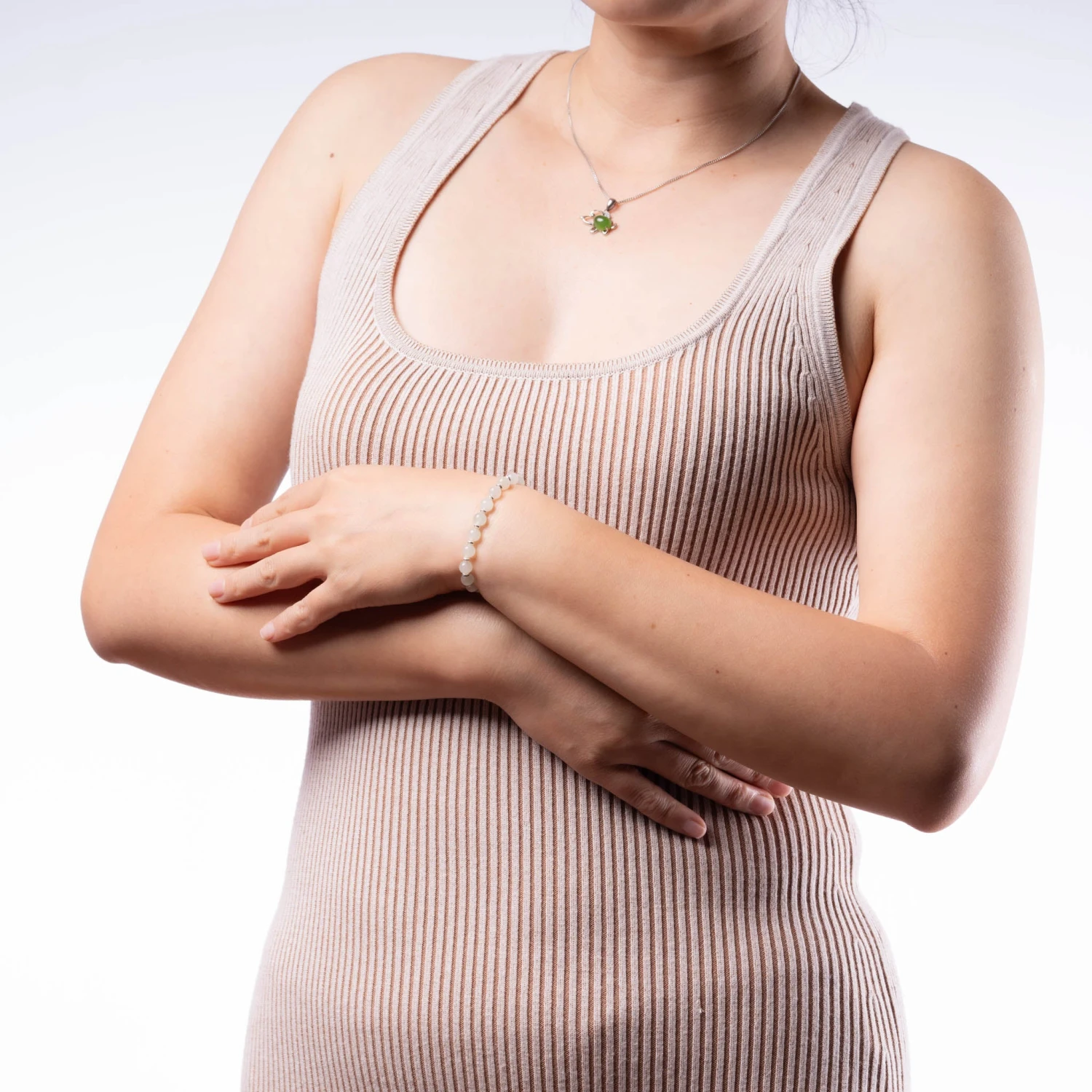 Manifest your sense of calm and elegance with the Moonlit Haven Jade Bracelet, crafted with luminous translucent white jade beads. Accented with polished sterling silver spacers, this bracelet is a timeless symbol of purity, serenity, and understated sophistication.