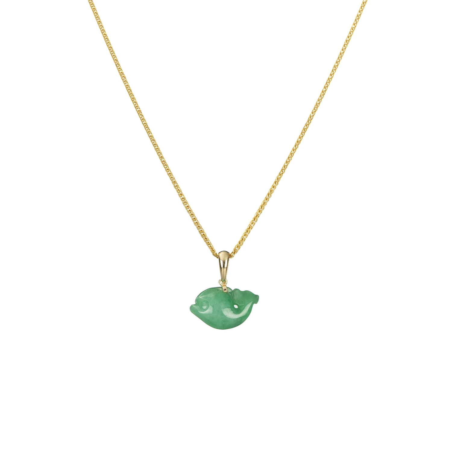 To further elevate its luxurious appeal, the pendant is set in 18K yellow gold. The gold setting adds a warm contrast to the cool green of the jade, creating a harmonious balance that mirrors the tranquil spirit of the dolphin.